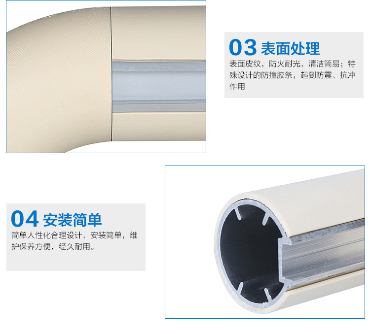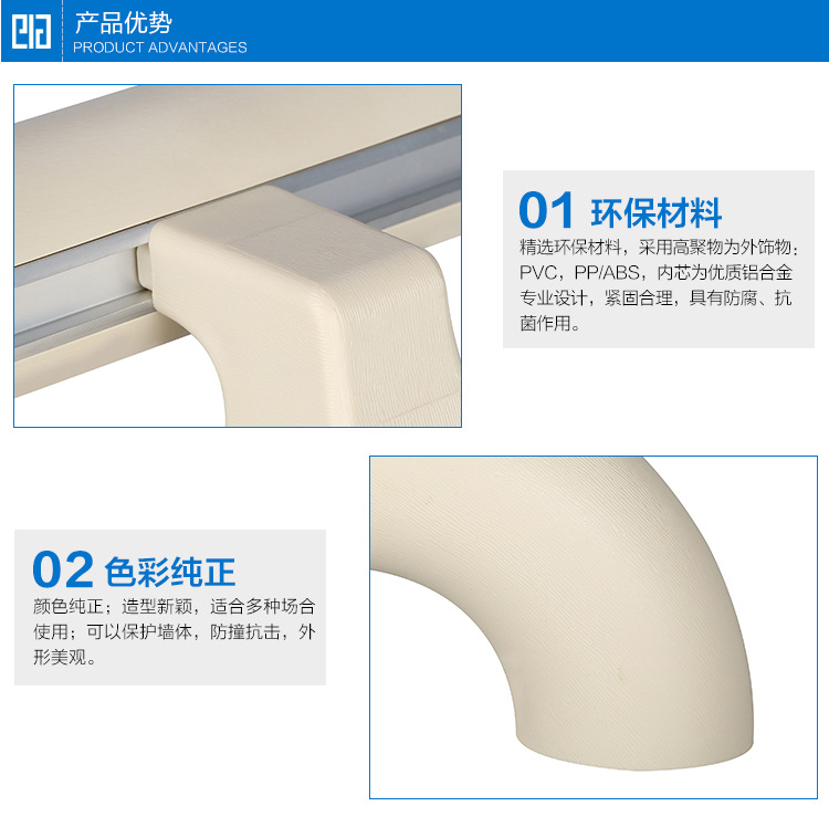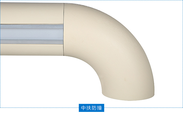 抗菌防撞扶手由抗菌PVC面板、優(yōu)質(zhì)鋁合金內(nèi)襯、彎頭、支撐架等組成;設(shè)計(jì)符合人體力學(xué)的要求,手握時(shí)有舒適感;表面PVC面板采用高分子抗菌材料,有防滑紋路,可抗菌、防污、不易變色,便于清潔,具有抗菌性、阻燃性、耐寒性等特性,產(chǎn)品經(jīng)國(guó)家權(quán)威機(jī)構(gòu)檢驗(yàn)合格;整體色澤均勻,無(wú)明顯色差;扶手內(nèi)襯鋁型材,采用優(yōu)質(zhì)的鋁錠擠出成型,有堅(jiān)固和防撞效果;扶手在每個(gè)轉(zhuǎn)角處有陰陽(yáng)角連接配合,可使扶手的美觀無(wú)縫連接及保護(hù)墻面。