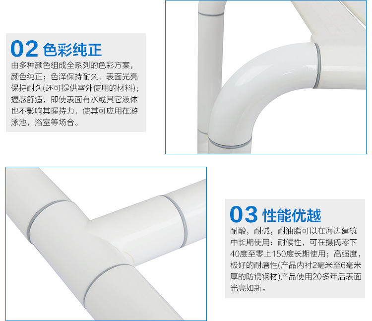 采用4mm厚度的高品質(zhì)德國尼龍材料,內(nèi)襯采用304不銹鋼管或優(yōu)質(zhì)鋁合金組成;有抗菌、防火、耐磨、耐酸、耐堿、耐油脂及防滑等性能;表面有防滑浮點,產(chǎn)品是能達到食品級的環(huán)保材料;有抗沖擊型,產(chǎn)品表面撞擊后不會像金屬管材產(chǎn)生凹痕,不會有任何傷痕;有耐溫性,可以在攝氏零下四十度到零上五十度中長期使用,可為客戶提供配色服務(wù),色彩多樣,整潔美觀,使墻面充滿活力,保養(yǎng)方便、持久耐用。