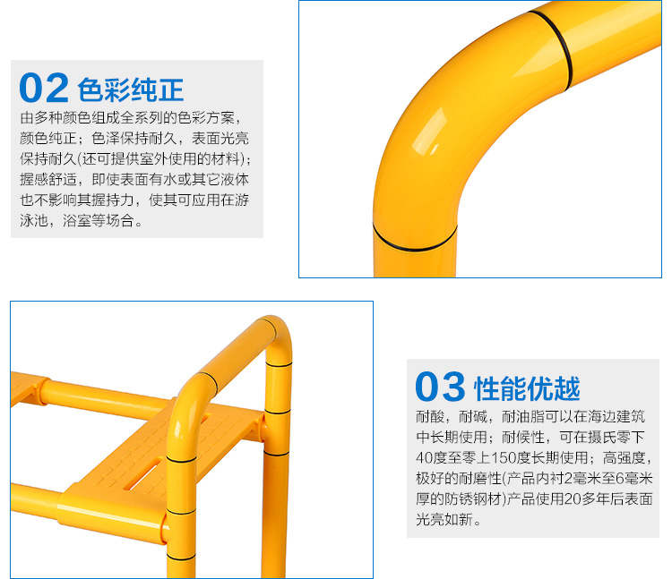 采用4mm厚度的高品質(zhì)德國(guó)尼龍材料,內(nèi)襯采用304不銹鋼管或優(yōu)質(zhì)鋁合金組成;有抗菌、防火、耐磨、耐酸、耐堿、耐油脂及防滑等性能;表面有防滑浮點(diǎn),產(chǎn)品是能達(dá)到食品級(jí)的環(huán)保材料;有抗沖擊型,產(chǎn)品表面撞擊后不會(huì)像金屬管材產(chǎn)生凹痕,不會(huì)有任何傷痕;有耐溫性,可以在攝氏零下四十度到零上五十度中長(zhǎng)期使用,可為客戶(hù)提供配色服務(wù),色彩多樣,整潔美觀,使墻面充滿(mǎn)活力,保養(yǎng)方便、持久耐用。