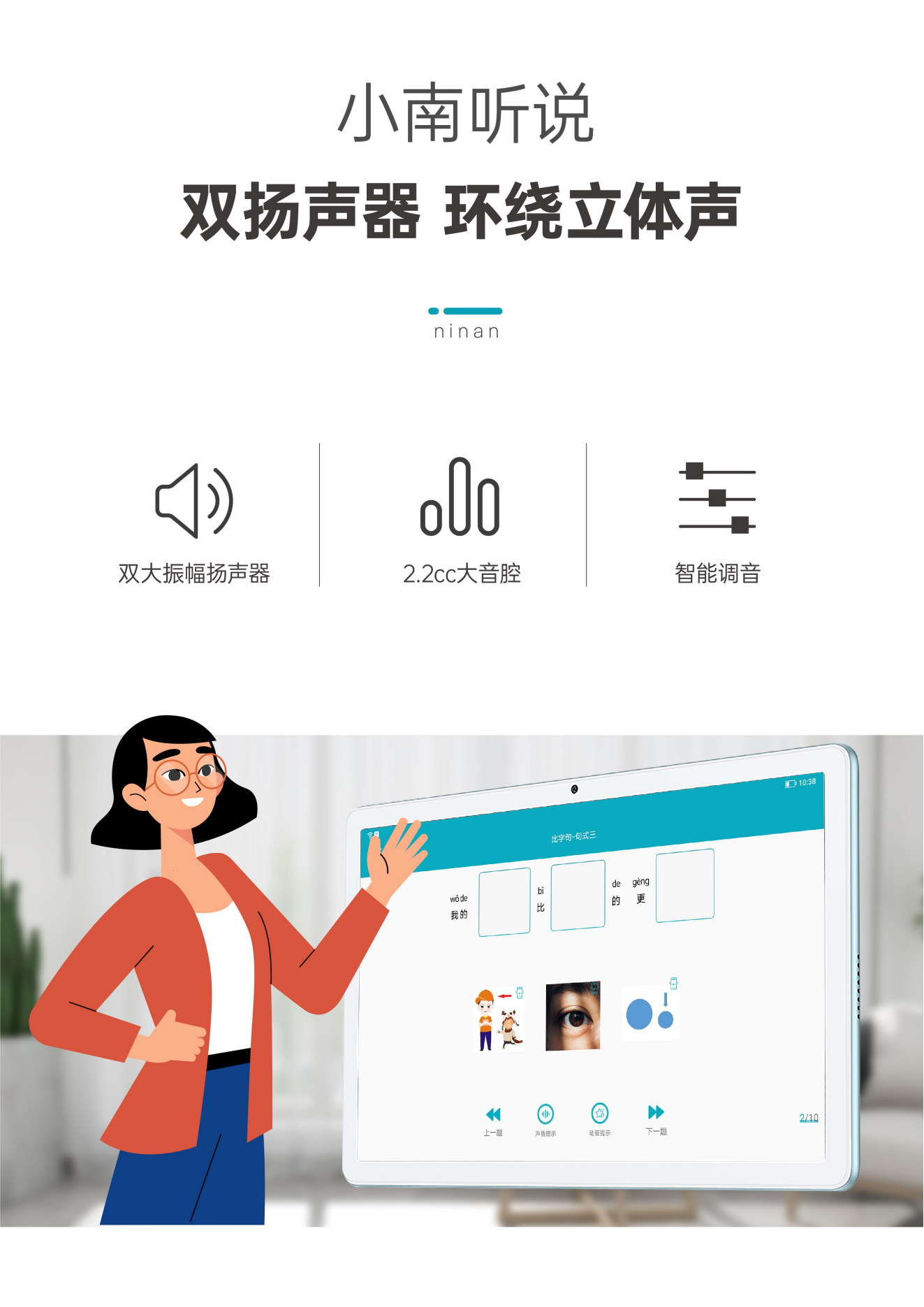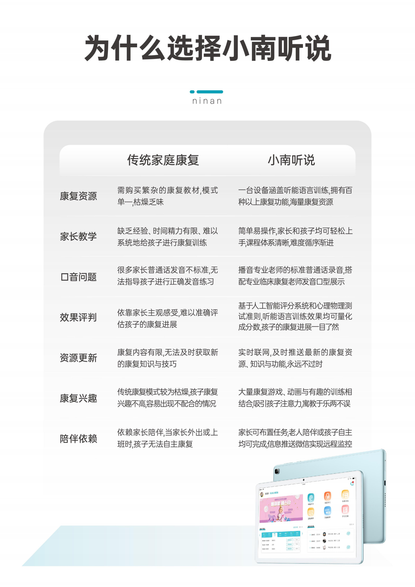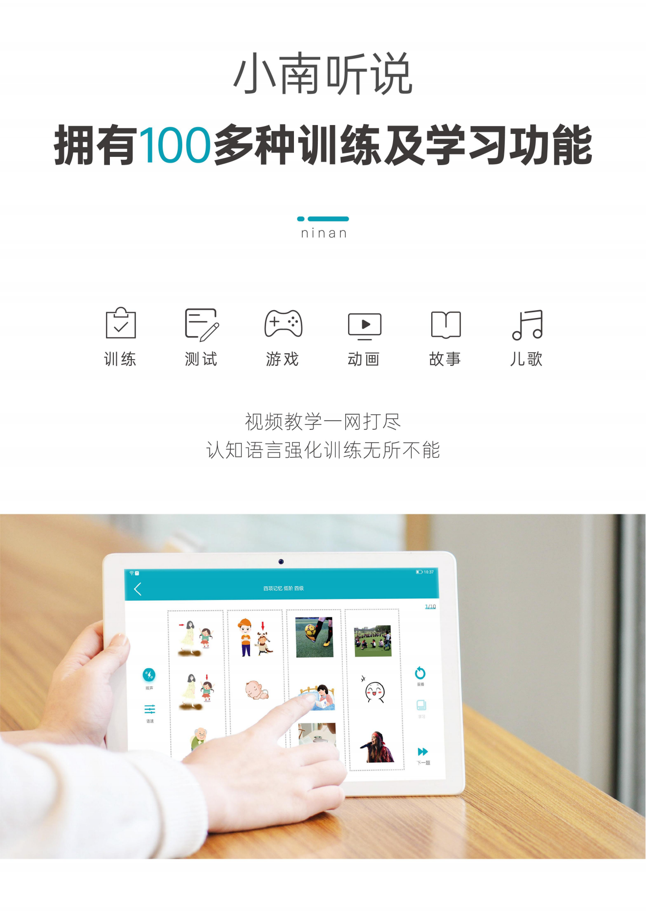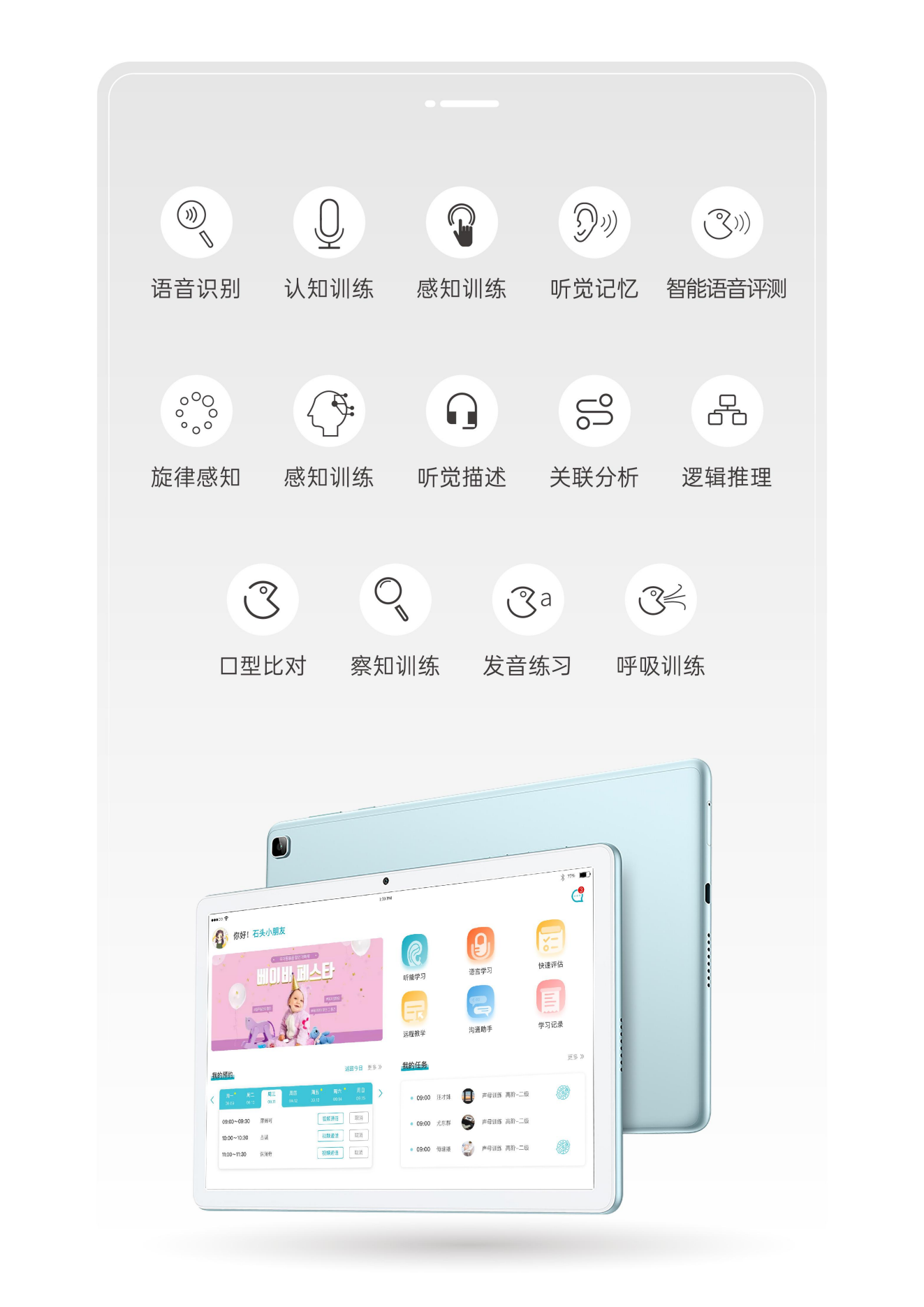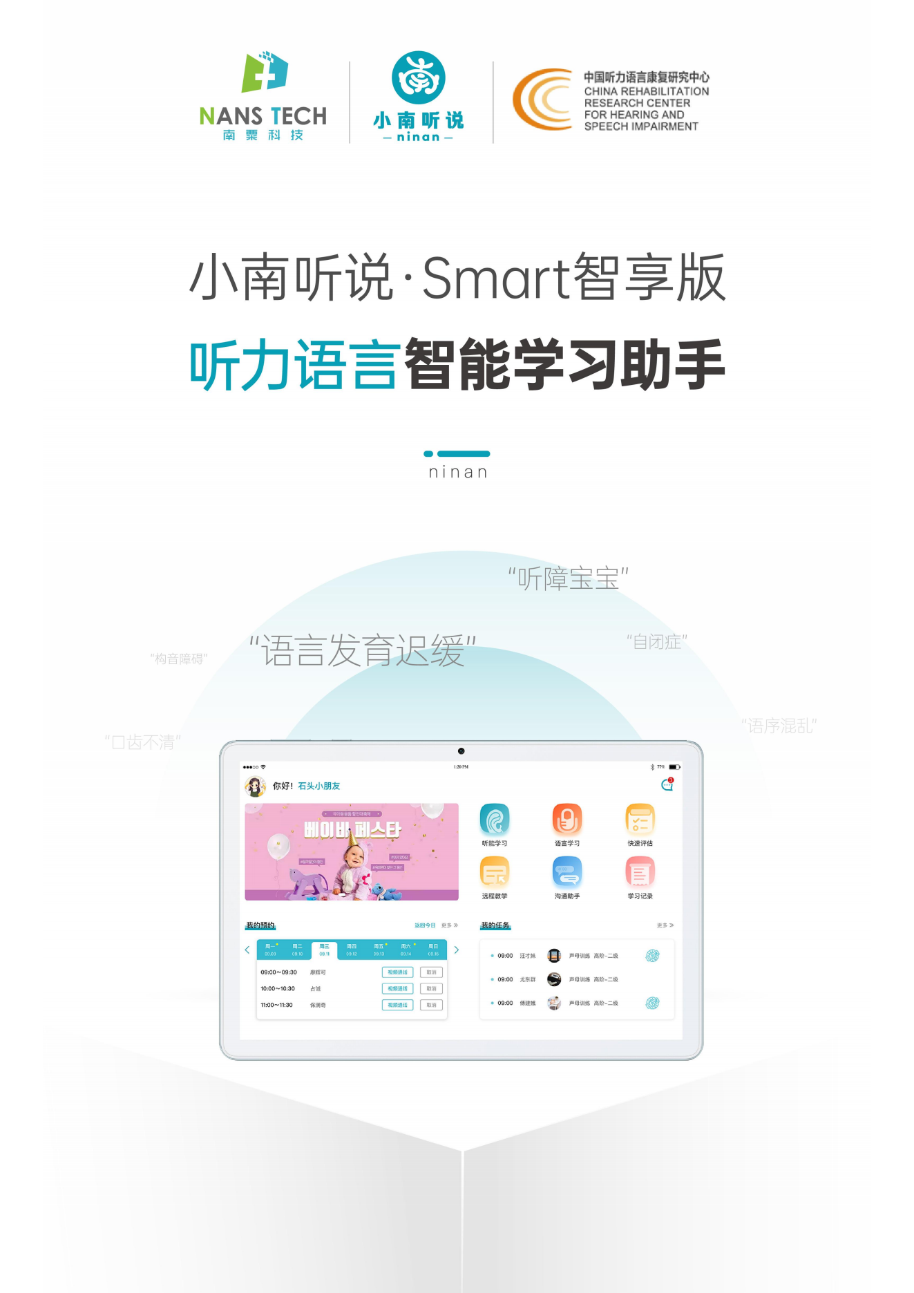 小南聽說聽力語言智能康復(fù)助手是一款基于人工智能和數(shù)字康復(fù)技術(shù)的語言康復(fù)產(chǎn)品,主要面向各類語言、認知及聽力障礙的兒童,由一套智能訓(xùn)練系統(tǒng)和一套智能硬件設(shè)備組成,目前主要有專業(yè)版和智享版兩種硬件形態(tài),可實現(xiàn)智能化的家庭/機構(gòu)全方位康復(fù)訓(xùn)練。