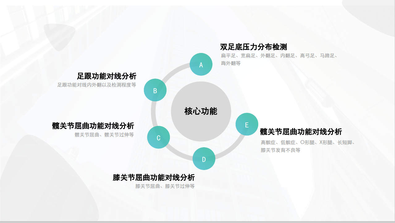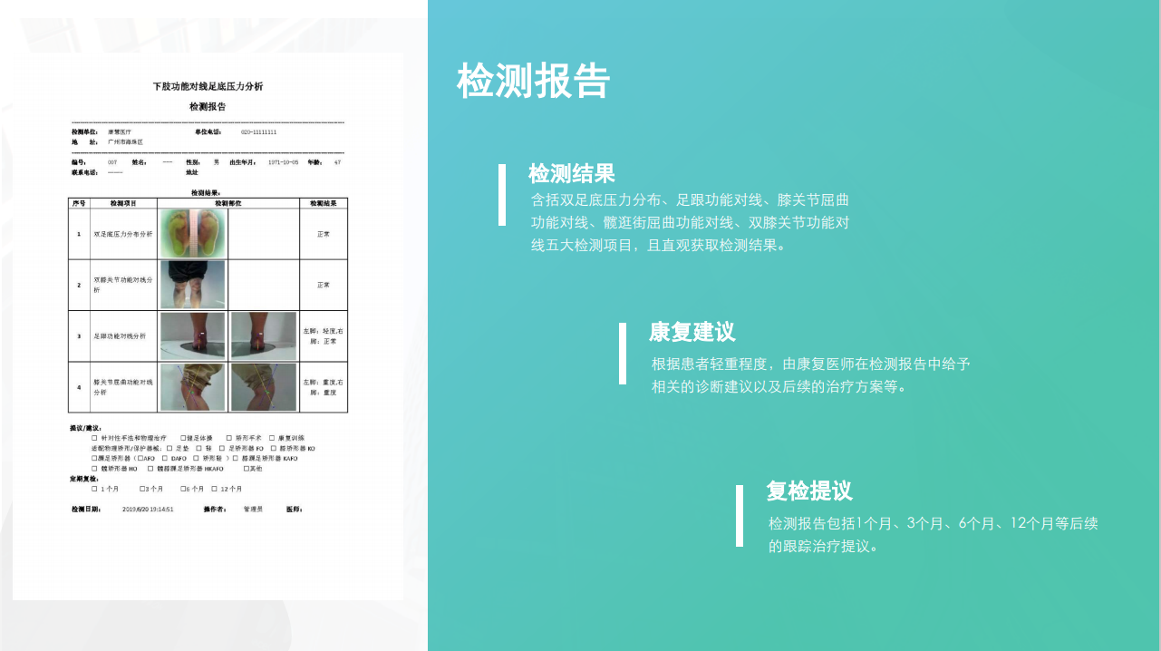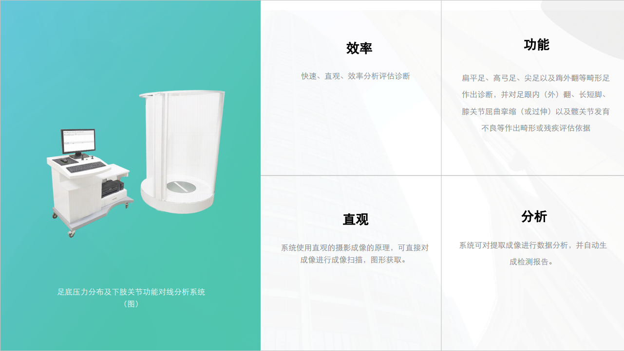 功能:扁平足、高弓足、尖足以及踇外翻等畸形足 作出診斷,并對足跟內(nèi)(外)翻、長短腳、 膝關(guān)節(jié)屈曲攣縮(或過伸)以及髖關(guān)節(jié)發(fā)育 不良等作出畸形或殘疾評估依據(jù) 適用單位:康復(fù)中心、康復(fù)醫(yī)院以 及綜合醫(yī)院設(shè)罝的康復(fù) 醫(yī)學科 ;假肢、矯形器康復(fù)中心;各級康復(fù)醫(yī)療機構(gòu)(三甲康復(fù)科)、各級康復(fù)訓練機構(gòu)(康復(fù)醫(yī)療康復(fù)訓練);各區(qū)設(shè)置的康復(fù)中心、康復(fù)門診、康復(fù)療養(yǎng)院、助殘養(yǎng)老機構(gòu);兒童特殊學校等