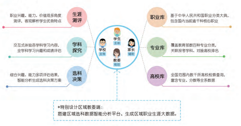 核心功能: 通過霍蘭德興趣測評量表、多元智能測評量表、MBTI職業(yè)性格測評量表、WVI職業(yè)價值觀測試量表進行興趣、能力、性格和價值觀的綜合分析,科學測評系統(tǒng)和完善的報告,智能推薦適合學科及專業(yè)職業(yè) 從選科決策、專業(yè)定位、職業(yè)方向到生涯規(guī)劃,形成完整的學業(yè)與生涯規(guī)劃路徑。從離學生最近的學科選擇開始生涯之路的規(guī)劃,與學生的生活更接軌。大數(shù)據(jù)報告,幫助老師快速掌握全校學生的選擇意象。豐富的資源庫內(nèi)容