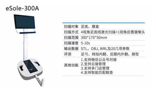 精易迅eSole-300A 足底三維掃描儀是一款專業(yè)針對人體足底三維掃描的測量設(shè)備,采用非接觸式激光掃描方式,10秒鐘內(nèi)完成人體足底的三維數(shù)據(jù)的采集,生成20幾項參數(shù),支持全負(fù)重,半負(fù)重或無負(fù)重足底掃描,可以有效的開展矯形鞋墊設(shè)計、個性化定制足墊、科學(xué)選鞋、足病診斷和足病矯正等多種工作;廣泛應(yīng)用于醫(yī)療、體育、鞋店零售等領(lǐng)域
