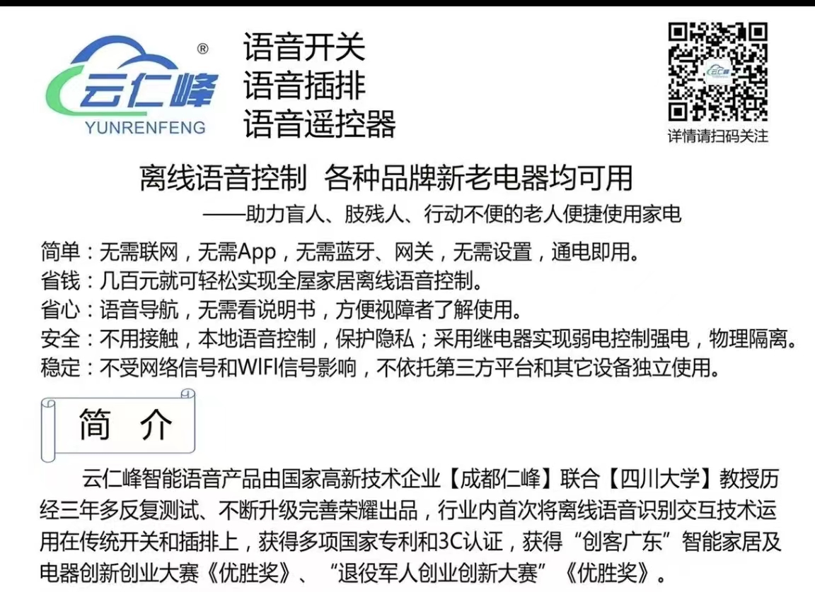 離線語音控制 各種品牌新老電器均可用 ——助力盲人、肢殘人、行動不便的老人便捷使用家電 簡單:無需聯(lián)網(wǎng),無需App,無需藍牙、網(wǎng)關(guān),無需設(shè)置,通電即用。 省錢:幾百元就可輕松實現(xiàn)全屋家居離線語音控制。 省心:語音導航,無需看說明書。 安全:不用接觸,本地語音控制,保護隱私;采用繼電器實現(xiàn)弱電控制強電,物理隔離。 穩(wěn)定:不受網(wǎng)絡(luò)信號和WlFl信號影響,不依托第三方平臺和其它輔助設(shè)備獨立使用。