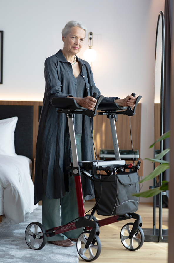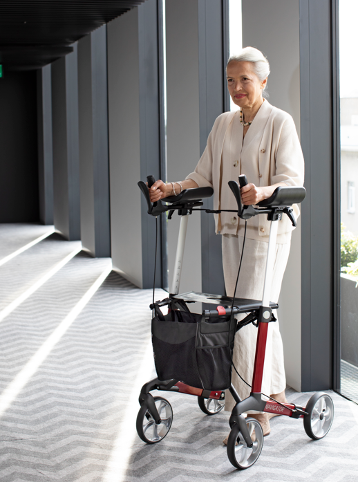 瑞云-航海家是為患有關(guān)節(jié)炎或手部功能受限的用戶開發(fā)的助行器,兼具功能性與舒適性。 前臂支撐架主要由大尺寸的海綿墊和手剎組成,用戶通過手臂的力量推動(dòng)助行器前行,有固定式和旋轉(zhuǎn)式兩種類型可旋轉(zhuǎn)的支撐架有三個(gè)調(diào)節(jié)角度,滿足不同用戶的需求。
