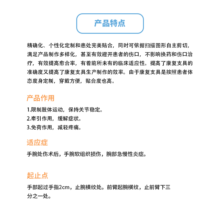 產(chǎn)品特點(diǎn) 精確化、個(gè)性化定制和患處完美貼合,同時(shí)可依據(jù)掃描圖形自主剪切,滿足產(chǎn)品制作多樣化,甚至有效避開患者的傷口,不影響換藥和傷口治療,有效提高愈合率,有著前所未有的臨床適應(yīng)性。提高了康復(fù)支具的準(zhǔn)確度又提高了康復(fù)支具生產(chǎn)制作的效率。由于康復(fù)支具是按照患者體態(tài)度身定制,穿戴方便,貼合度也高。 產(chǎn)品作用 1.限制肢體運(yùn)動,保持關(guān)節(jié)穩(wěn)定。 2.牽引作用,緩解癥狀。 3.免荷作用,減輕疼痛。