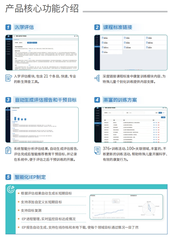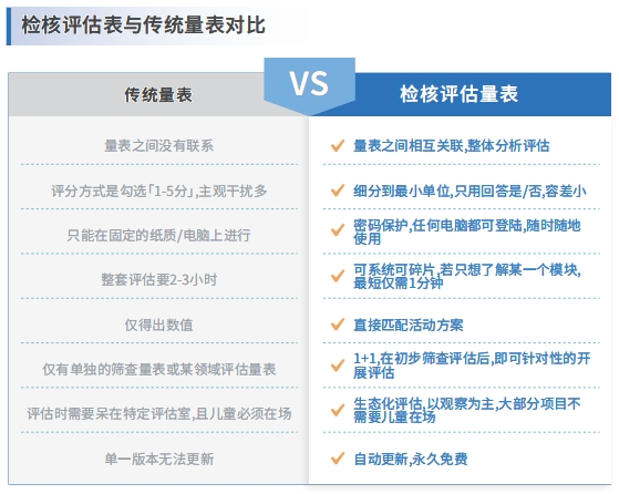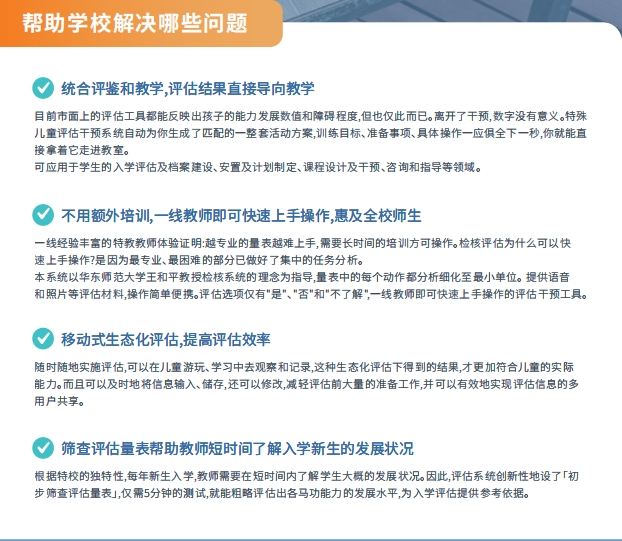 特殊兒童評估干預系統(tǒng)是一套以檢核評估理念為依據(jù)的非標準化評估工具,從特殊兒童能力角度出發(fā),適用于各類特殊兒童,包含感知、認知、運動、社會適應、生活自理、社交技巧、語言與溝通七大領域評估,同時系統(tǒng)內(nèi)嵌入的活動方案為新晉特教教師提供了個訓實操參考,是一款簡單實用并兼具專業(yè)性的評估工具。
