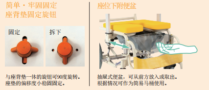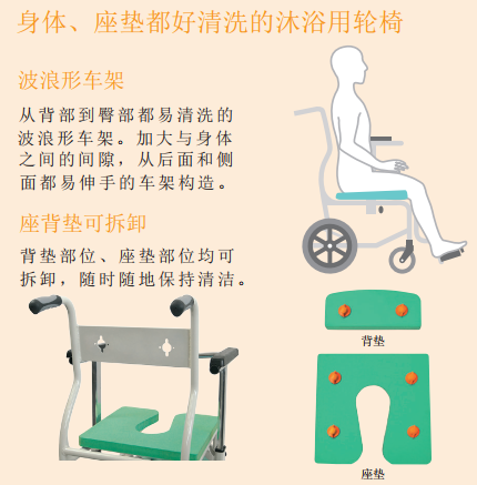 身體、座墊都易清洗的沐浴用輪椅,波浪形車架,加大了與身體之間的間隙,從后面或者側(cè)面都易伸手清潔身體??刹鹦兜娜彳汦VA座背墊,親膚防滑易清潔?;顒臃鍪趾突顒幽_,方便移乘,腳踏式剎車,方便安全。帶應(yīng)急用便盆。