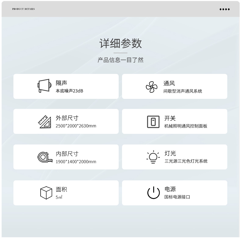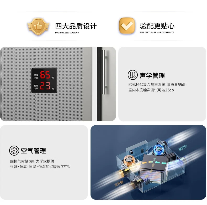型號:P250 隔聲:室外環(huán)境噪聲≤55dB (A),室內(nèi)本底噪聲≤20dB (A) 環(huán)保:甲醛釋放量≤0.4mg/L,滿足《室內(nèi)裝飾裝修材料及人造板棉制品中甲醛釋放量》 參考標(biāo)準(zhǔn): JJF 1191-2019《測聽室聲學(xué)特性校準(zhǔn)規(guī)范》 GB 3096-2022《聲環(huán)境質(zhì)量標(biāo)準(zhǔn)》 GB 50325-2020《民用建筑工程室內(nèi)環(huán)境污染控制標(biāo)準(zhǔn)》 適用范圍:ABR檢查、OAE檢查