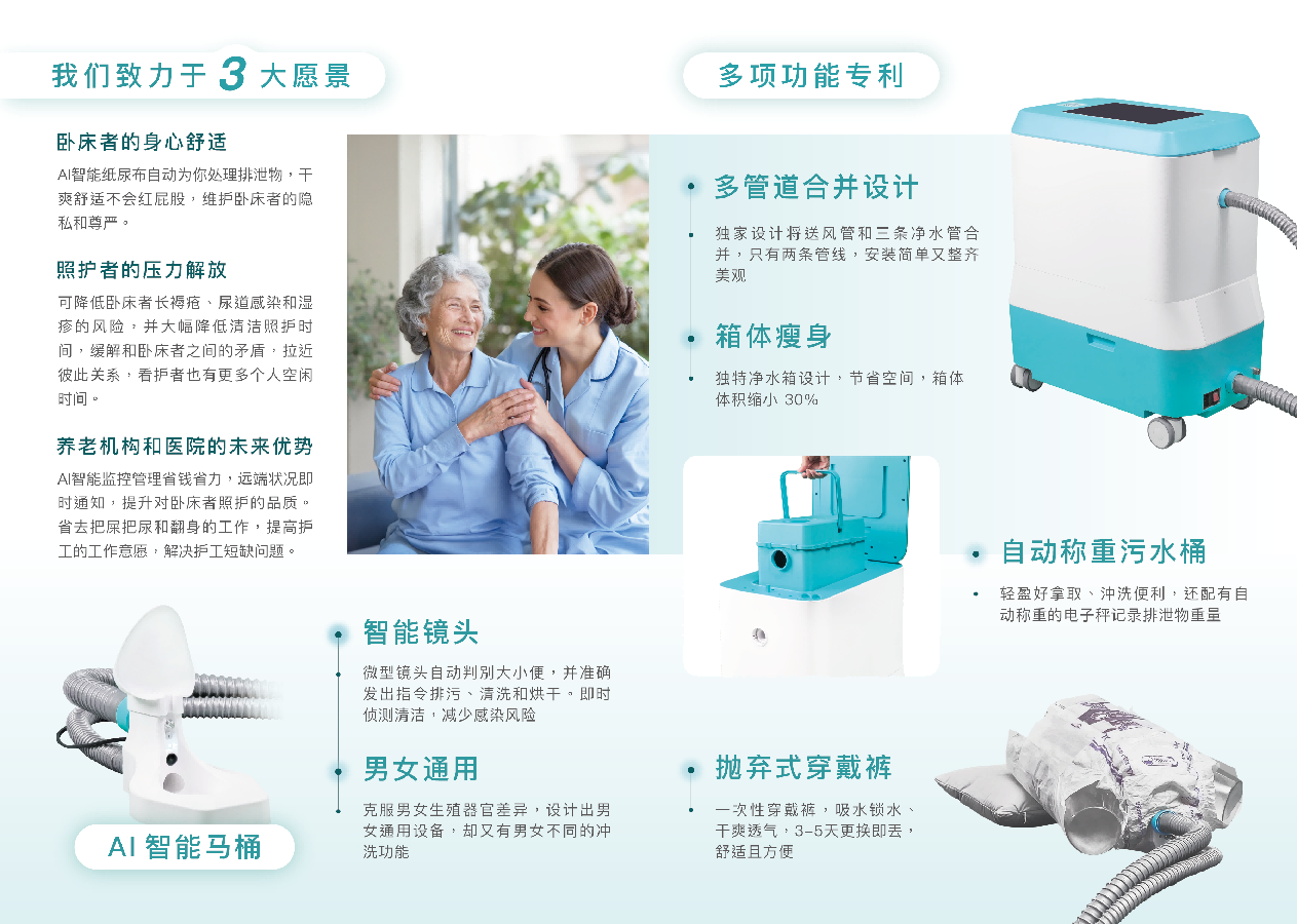 笑籽排泄機(jī)器人也稱為AI智能紙尿布,是專為臥床失能病人設(shè)計的產(chǎn)品,在床上用的智能馬桶,由AI智能識別大小便,自動啟動不同的模式為使用者清潔大小便,并且沖洗烘干,還會拍照記錄排泄物的樣態(tài)、時間和重量,協(xié)助了解使用者的情況。特制專用的一次性尿布,用兩三天丟棄,干凈輕松方便。AI可以啟動排尿、頻尿和排便不同模式?jīng)_洗烘干,達(dá)到省水省電的效益。