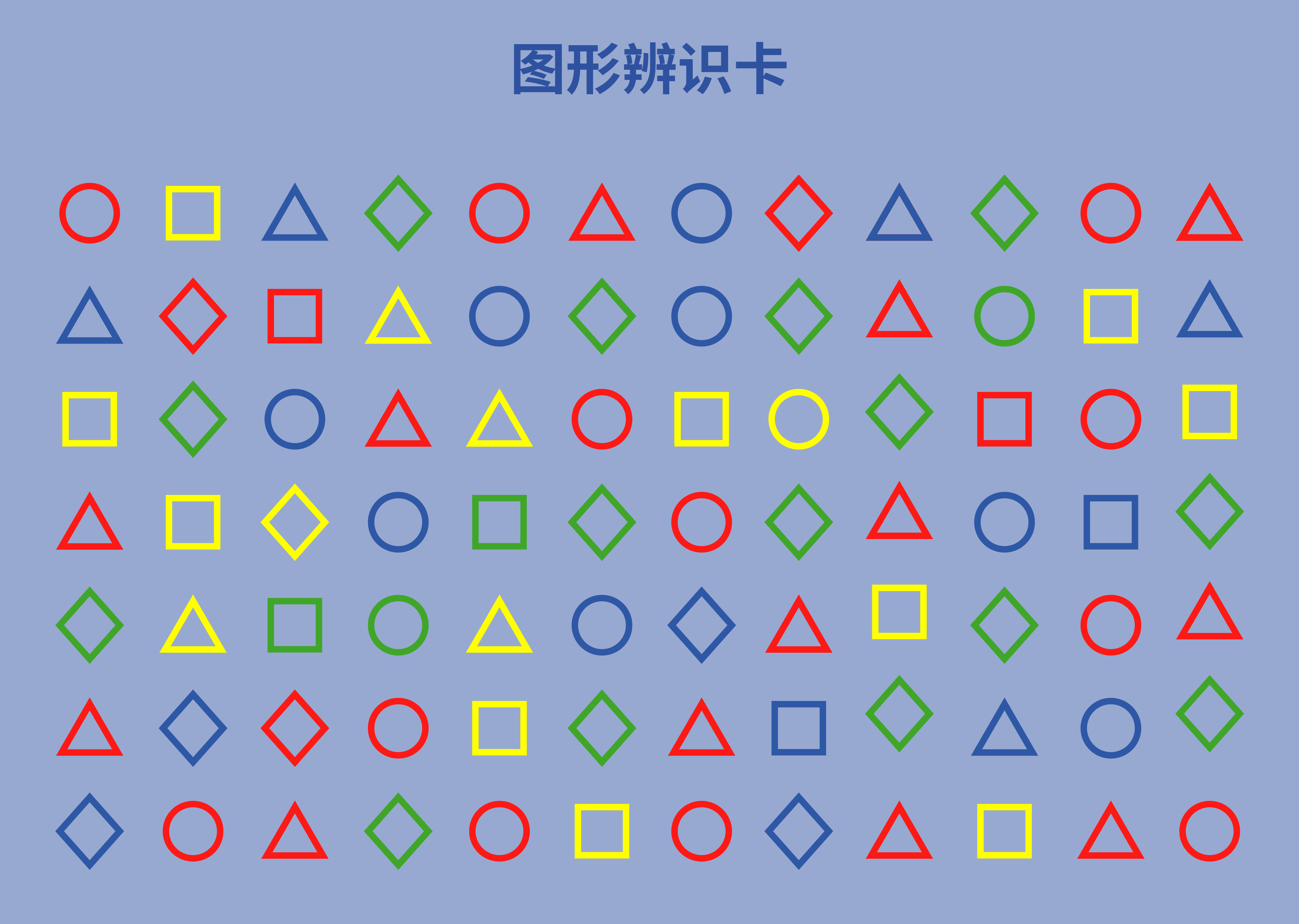 圖形辨識卡是一張訓練卡,7行12列,上面分別以圓形、三角形、正方形、菱形,四種圖形呈現(xiàn)。它的游戲規(guī)則是當遇到圓形時拍手1下,當遇到正方形時拍桌子1下,當遇到三角形時拍腿1下,當遇到菱形時連拍手2下,訓練循序漸進展開,直到老年人能獨立完成整套訓練卡游戲。通過圖形辨識卡,能有效鍛煉老人的手指靈活性,提升老人的空間感和反應力,鍛煉大腦活力和認知水平。