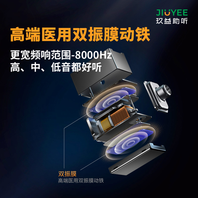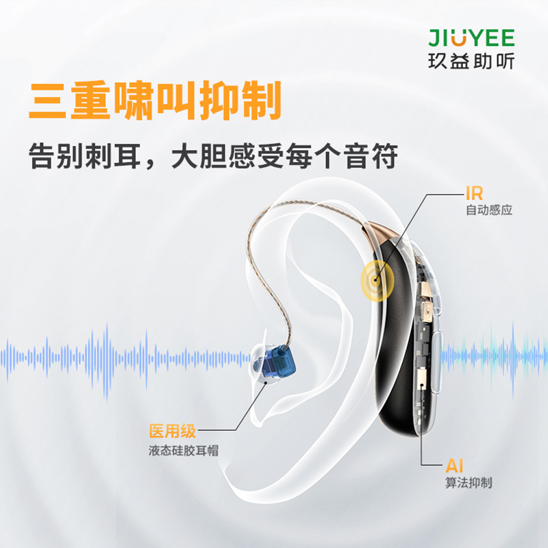 玖益醫(yī)療級(jí)智能藍(lán)牙耳背式助聽器(RIC P2 特大功率) 適合重至極重度聽損,采用玖益獨(dú)創(chuàng)“三芯系統(tǒng)技術(shù)”、80dB滿檔增益,140dB最大聲壓級(jí) ,64通道WDRC及AI降噪技術(shù)、智能驗(yàn)配APP及遠(yuǎn)程驗(yàn)配、居家5-8分鐘可完成測(cè)聽和驗(yàn)配,IP67防水,140小時(shí)長續(xù)航,暢享舒適溝通。
