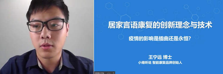 “小南聽說”智能康復(fù)品牌創(chuàng)始人、畢業(yè)于美國明尼蘇達(dá)大學(xué)認(rèn)知與腦科學(xué)專業(yè)的王寧遠(yuǎn)博士結(jié)合了近年來的技術(shù)發(fā)展,與參會人員探討了“創(chuàng)新居家言語康復(fù)的理念與技術(shù)--疫情的影響是插曲還是永恒?”這樣一個(gè)話題。在新技術(shù)的加持下,遠(yuǎn)程康復(fù)與居家康復(fù)將會成為傳統(tǒng)線下康復(fù)模式的必要補(bǔ)充。
