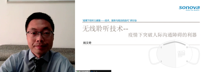 中國聾人協(xié)會信息無障礙委員會副主任、索諾瓦(Sonova)聽力全國項(xiàng)目技術(shù)經(jīng)理姚文奇先生為大家分享了“疫情下突破人際溝通障礙的利器——無線聆聽技術(shù)”的細(xì)節(jié)。