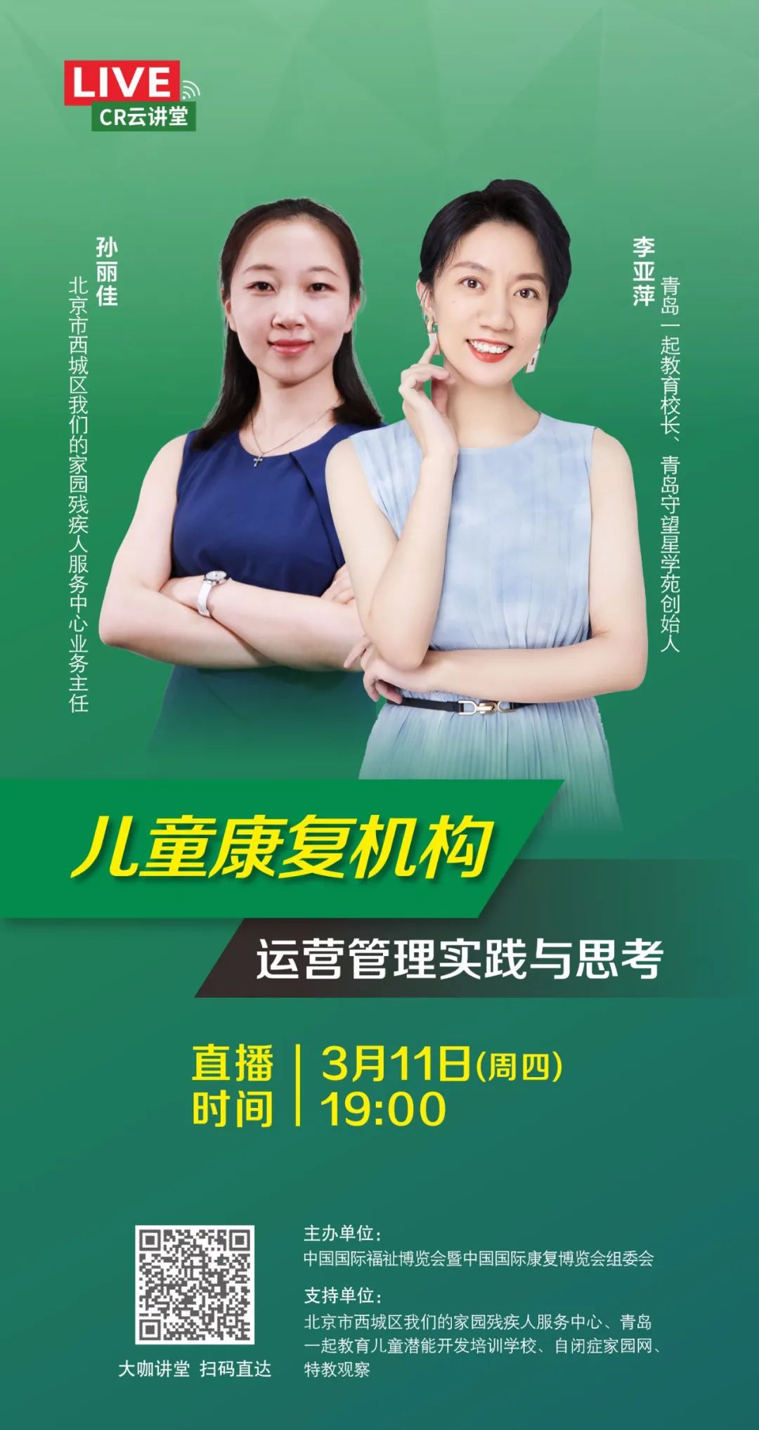 3月11日(周四),CR EXPO直播課邀請到青島一起教育校長李亞萍、北京市西城區(qū)我們的家園殘疾人服務(wù)中心業(yè)務(wù)主任孫麗佳,與大家分享“兒童康復(fù)機(jī)構(gòu)運(yùn)營管理實踐與思考”。
