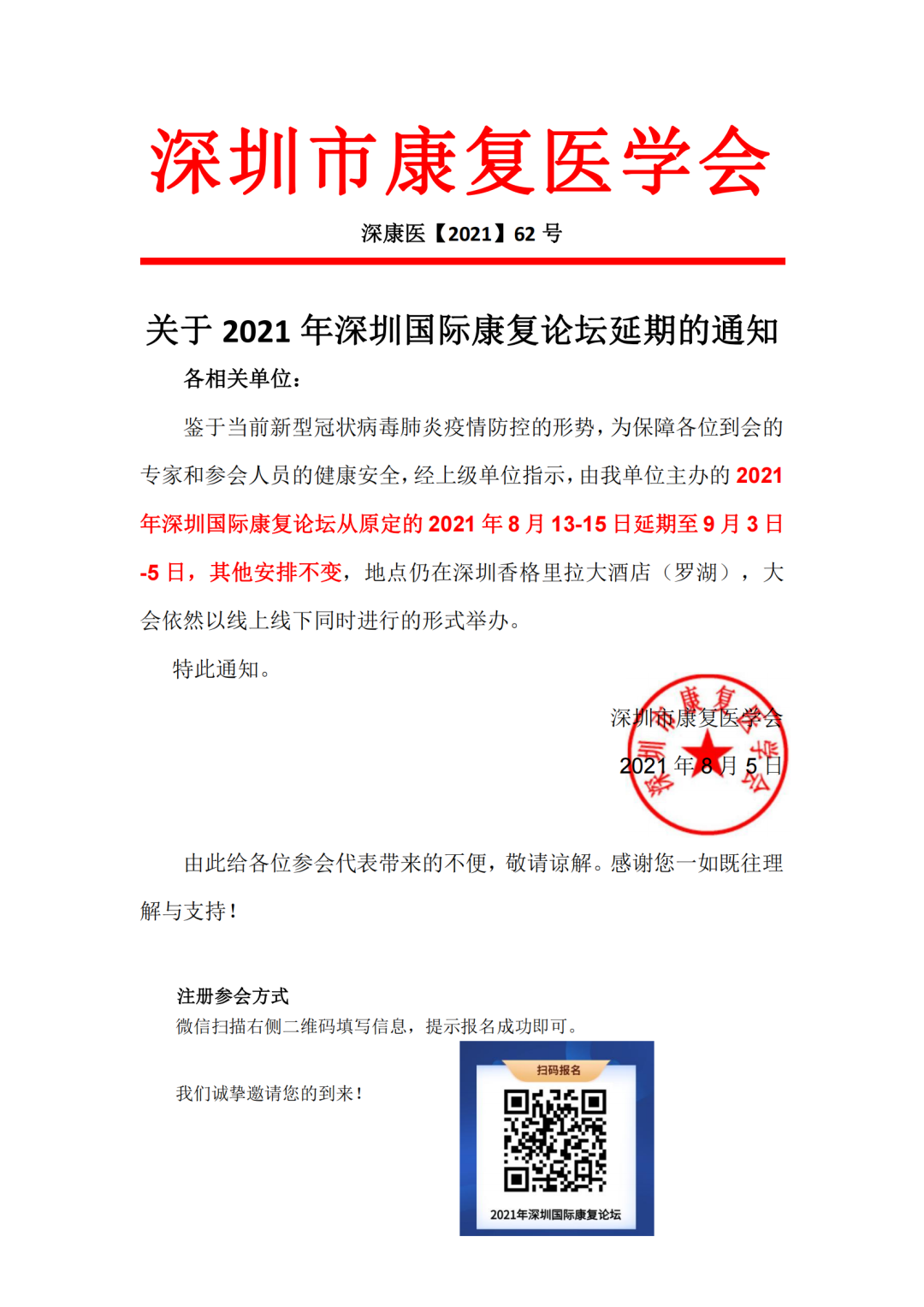 鑒于當(dāng)前新型冠狀病毒肺炎疫情防控的形勢,為保障各位到會的專家和參會人員的健康安全,經(jīng)上級單位指示,2021年深圳國際康復(fù)論壇從原定的2021年8月13-15日延期至9月3日-5日,其他安排不變,地點仍在深圳香格里拉大酒店(羅湖),大會依然以線上線下同時進行的形式舉辦。由此給各位參會代表帶來的不便,敬請諒解。