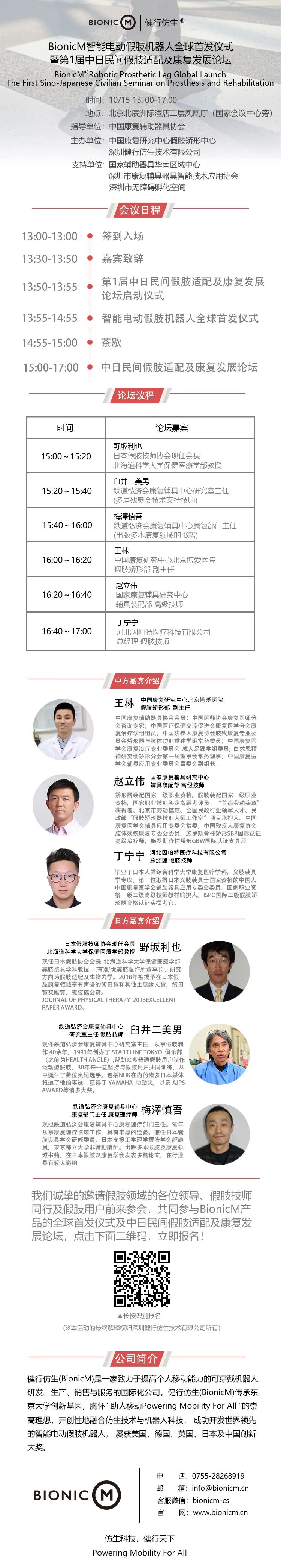 值此喜慶之際,BionicM(健行仿生)將參展2021中國國際福祉博覽會,智能電動假肢機器人全球首次正式發(fā)布,同時,BionicM將與福祉博覽會同期舉辦中日第1屆民間假肢適配及康復發(fā)展論壇,通過中日兩國假肢及康復領域權威專家之間的對話、交流、信息共享,促進兩個國家在假肢及康復領域的交流和合作。我們真誠邀請您一起見證全球首發(fā)的智造之光、及首屆中日民間假肢適配與康復發(fā)展的論壇盛舉!
