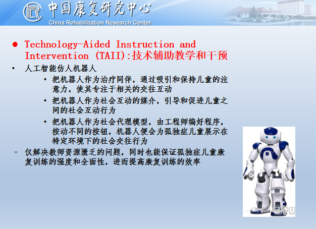 2020年,全美孤獨癥循證和實踐審查小組發(fā)表了28種孤獨癥最新循證治療方法。其中,技術輔助教學和干預作為一種高新輔助技術,值得業(yè)內(nèi)人士關注。如人工智能仿人機器人,為孤獨癥兒童展示在特定環(huán)境下的社會交往行為 ,解決教師資源匱乏的問題,同時也能保證孤獨癥兒童康復訓練的強度和全面性,進而提高康復訓練的效率。