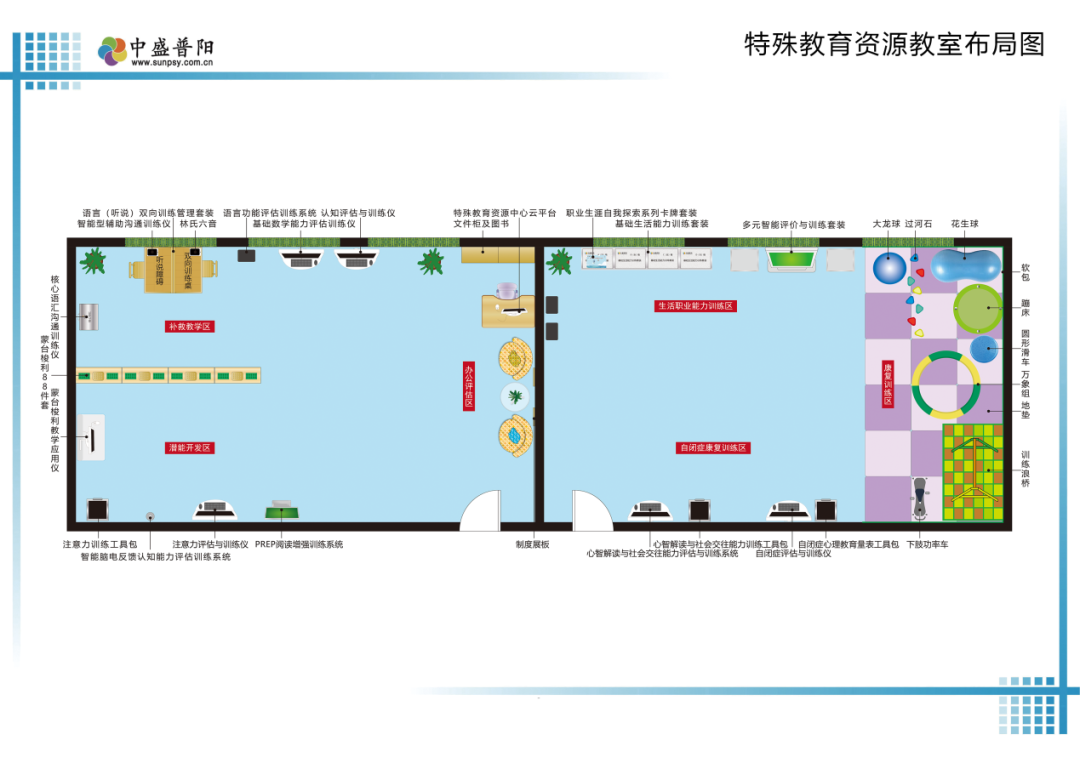 根據(jù)中盛普陽多年特殊教育隨班就讀資源教室的建設經驗,及滿足“十四五”特殊教育發(fā)展提升行動計劃針對資源教室的建設要求,對于功能室布局分布如下: