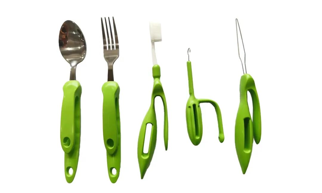 套裝由記憶成人勺子、記憶成人叉子、記憶成人牙刷、拉鏈輔助器、穿扣器5種產(chǎn)品組成。這些產(chǎn)品手柄材質(zhì)為形狀記憶聚合物,握柄可多次加熱軟化重新塑型,握柄的材質(zhì)無毒、無害、抗菌環(huán)保、易于清潔、不易退色。適用于手關(guān)節(jié)僵直、變形,身體活動(dòng)障礙人群使用。