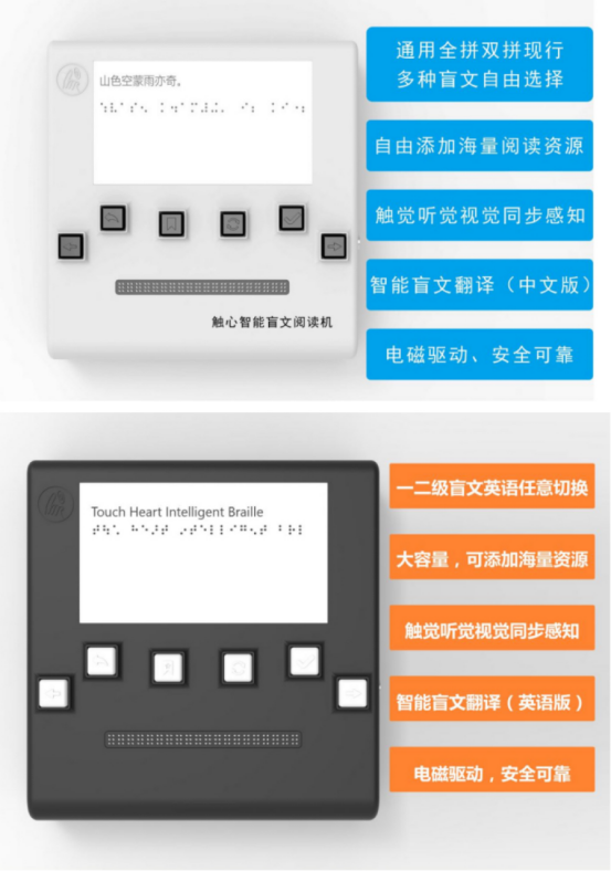 觸心智能盲文閱讀機(jī)有助于解決目前漢語盲文資源嚴(yán)重不足的難題。用戶可以閱讀海量漢語文檔,通用、全拼、現(xiàn)行、雙拼等盲文類型可以自由選擇;觸心智能盲文英語機(jī)有助于解決目前英語盲文資源嚴(yán)重不足的難題。用戶可以閱讀海量英語文檔,一級(jí)英語盲文、二級(jí)英語盲文可以自由選擇。