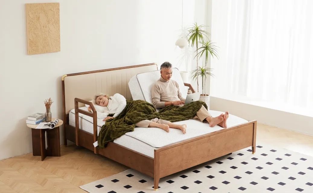 舒眠H921屬于適老化電動床,單人1.2米寬度尺寸,更加舒適。具備背部升降、腿部升降和整床升降,可滿足老人日常起居,方便上下床;以及后期處于護(hù)理階段,也方便家人照護(hù)。兩側(cè)扶手,便于抓握和儲物,后期根據(jù)老人需求,也可升級長護(hù)欄。