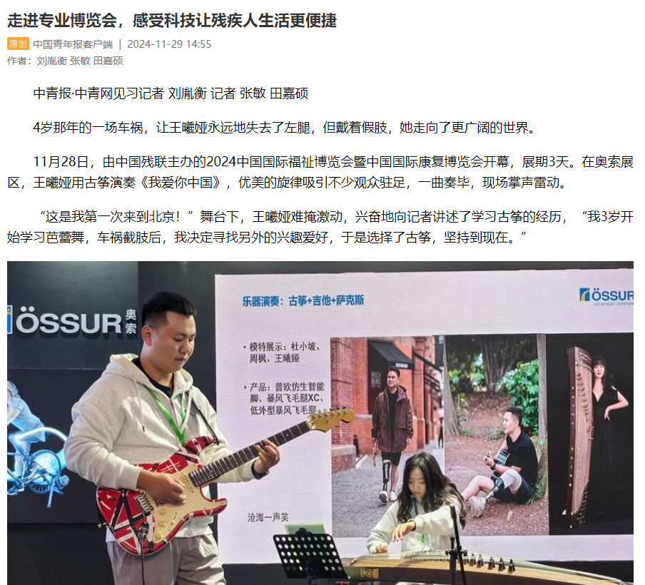 11月28日,由中國殘聯(lián)主辦的2024中國國際福祉博覽會(huì)暨中國國際康復(fù)博覽會(huì)開幕,展期3天。在奧索展區(qū),王曦婭用古箏演奏《我愛你中國》,優(yōu)美的旋律吸引不少觀眾駐足,一曲奏畢,現(xiàn)場(chǎng)掌聲雷動(dòng)。
