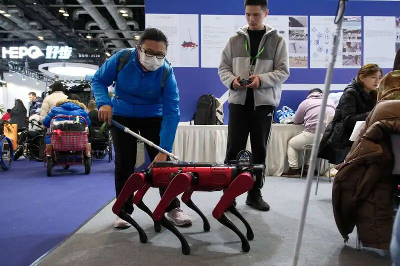 11月28日,2024中國國際福祉博覽會(huì)暨中國國際康復(fù)博覽會(huì)現(xiàn)場(chǎng),觀眾體驗(yàn)導(dǎo)盲機(jī)器人。田嘉碩/攝