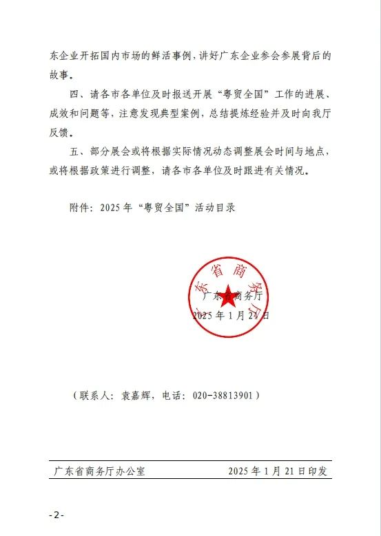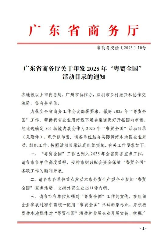 據(jù)了解,“粵貿(mào)全國”是廣東省政府為推動貿(mào)易高質(zhì)量發(fā)展而實(shí)施的一項(xiàng)重大工程,旨在通過一系列展會活動,幫助企業(yè)拓展市場、提升品牌影響力,進(jìn)一步推動廣東省乃至全國的經(jīng)濟(jì)發(fā)展。入圍展會將列入2025年全省商務(wù)重點(diǎn)工作,并優(yōu)先獲得政府相關(guān)政策扶持。