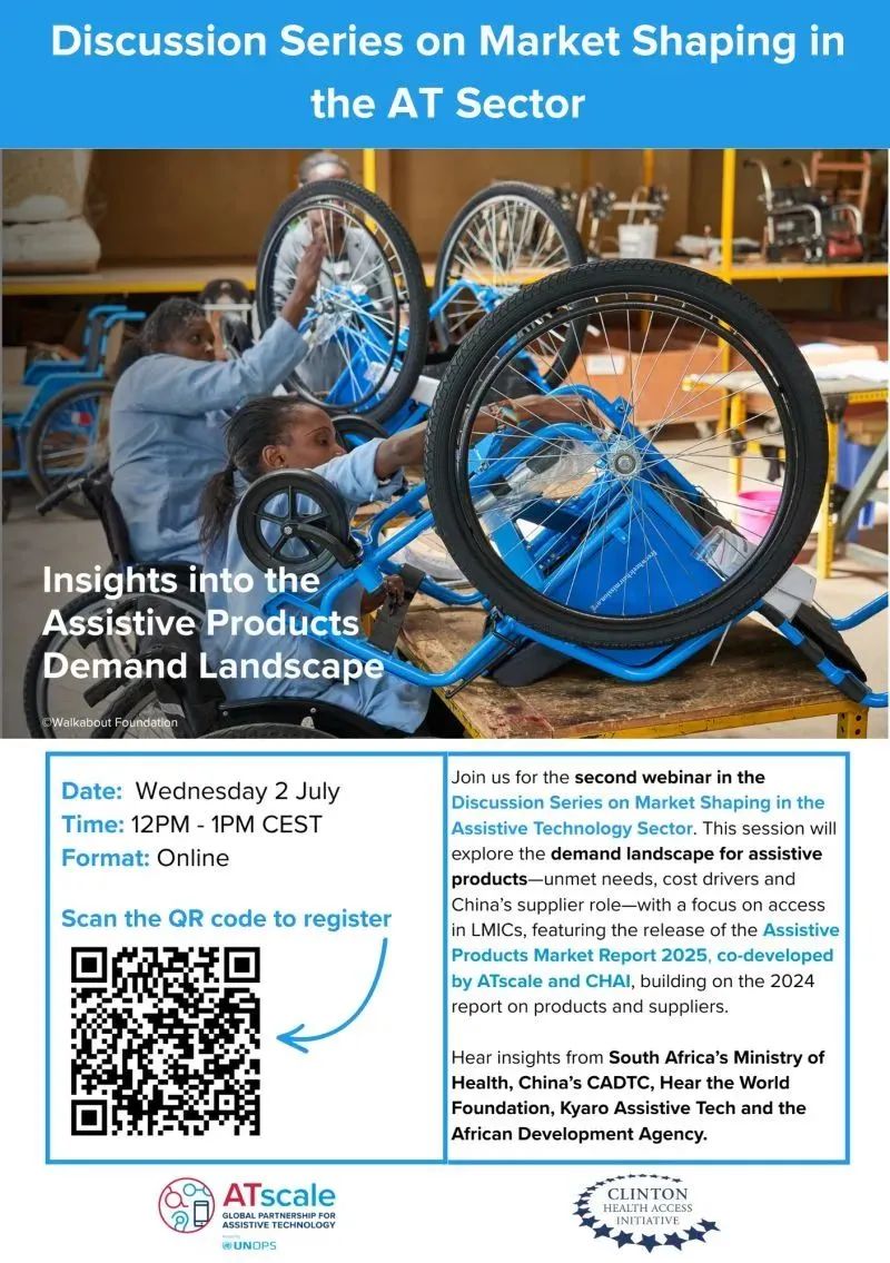本次研討會(huì)還將正式發(fā)布由 ATscale 與 CHAI 共同編寫的《輔助器具市場報(bào)告2025》(Assistive Products Market Report 2025),作為2024年報(bào)告的延續(xù),進(jìn)一步補(bǔ)充關(guān)于全球輔助器具市場需求與供應(yīng)的研究成果。并邀請來自南非衛(wèi)生部、中國殘疾人輔助器具中心(CADTC)、Hear the World 基金會(huì)、Kyaro Assistive Tech以及非洲發(fā)展機(jī)構(gòu)的嘉賓代表針對報(bào)告核心內(nèi)容與主題進(jìn)行發(fā)言。