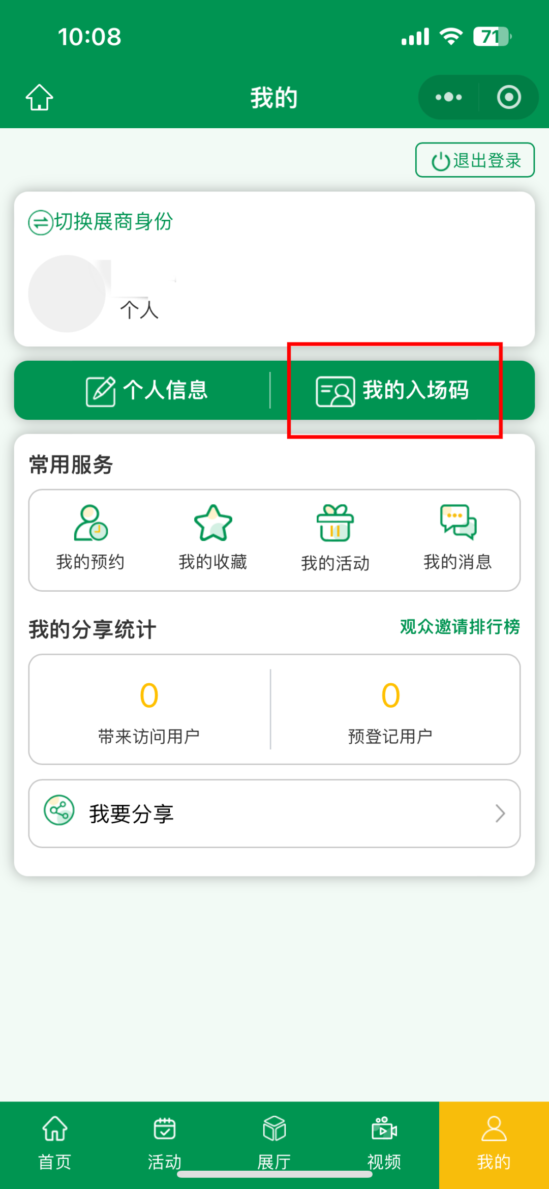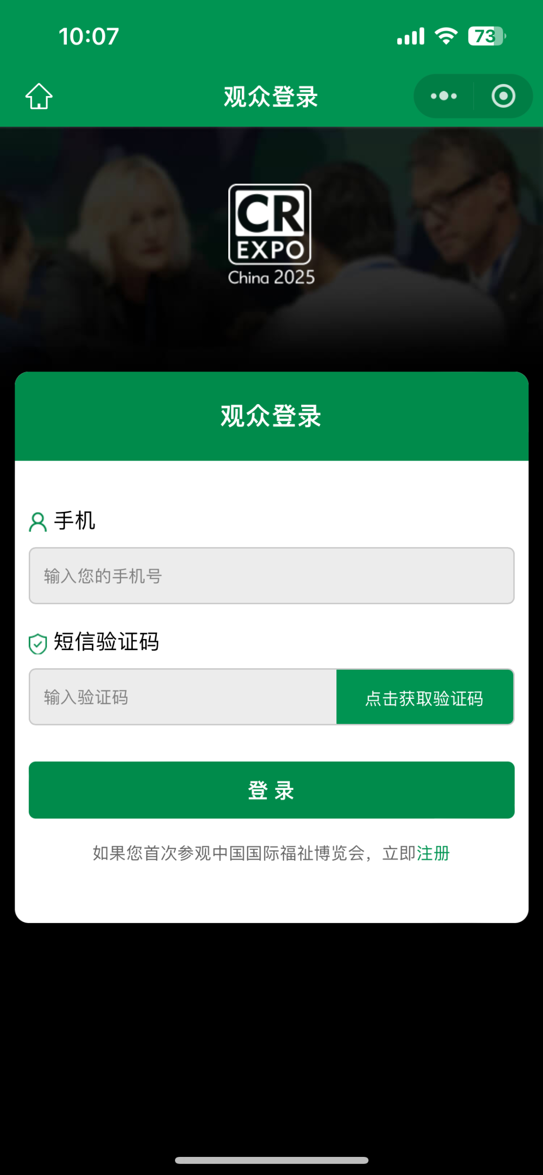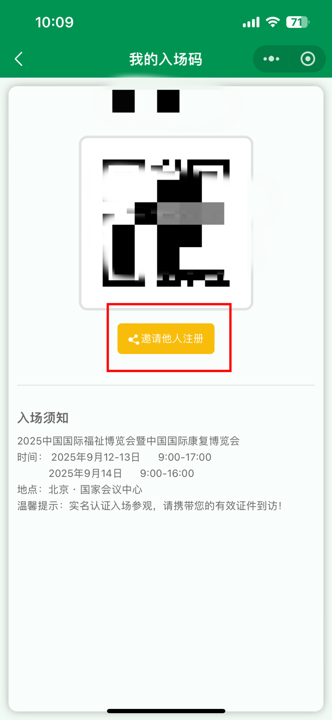登錄福祉博覽會官方小程序【福祉在線】→點擊【觀眾登錄】,輸入手機號及驗證碼→點擊【我的入場碼】,生成您的專屬邀請鏈接。