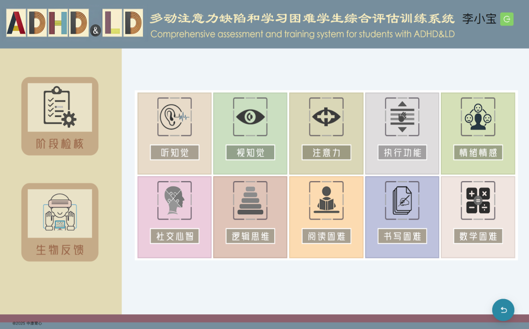 中康育心多動注意力缺陷及學(xué)習(xí)困難評估訓(xùn)練系統(tǒng),由數(shù)字康復(fù)管理平臺(醫(yī)療級推車)及多臺康復(fù)終端設(shè)備組成,適用于多動注意力缺陷及學(xué)習(xí)困難患者的數(shù)字化評估、能力測試和康復(fù)治療。本系統(tǒng)能有效提升醫(yī)生和康復(fù)師在專業(yè)評估、制定個別化教育計(jì)劃(IEP)、康復(fù)課題訓(xùn)練、數(shù)據(jù)記錄與總結(jié)等環(huán)節(jié)中的效率、準(zhǔn)確性與專業(yè)度。該系統(tǒng)通過智能算法確保評估與訓(xùn)練的標(biāo)準(zhǔn)化,提高了患者訓(xùn)練的標(biāo)準(zhǔn)化程度、準(zhǔn)確度與干預(yù)效率。多動及學(xué)習(xí)困難評估與訓(xùn)練系統(tǒng)本系統(tǒng)將傳統(tǒng)評估量表、神經(jīng)心理專項(xiàng)能力測驗(yàn)及生理信號(眼動)相結(jié)合,為患者提供智能化、精準(zhǔn)化的評估和康復(fù)服務(wù),支持院內(nèi)康復(fù)、教學(xué)指導(dǎo)、醫(yī)療診治輔助。