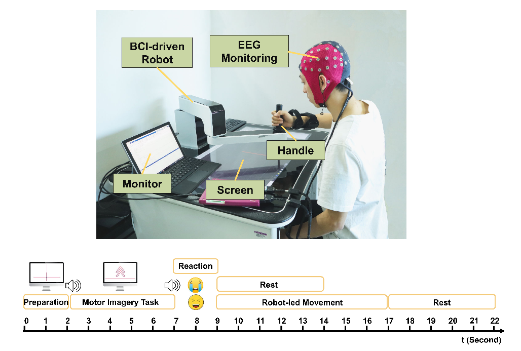 本項(xiàng)腦機(jī)交互技術(shù)實(shí)時(shí)解碼人體的運(yùn)動意圖進(jìn)而實(shí)現(xiàn)控制外部設(shè)備執(zhí)行相應(yīng)的動作。在康復(fù)訓(xùn)練過程中,患者可通過調(diào)動自身的主動運(yùn)動意圖控制康復(fù)機(jī)器人牽動偏癱側(cè)肢體執(zhí)行相應(yīng)的動作,肢體運(yùn)動反饋至大腦形成感覺,進(jìn)而影響下一次控制指令的發(fā)出,同時(shí),運(yùn)動感覺反饋可有效的刺激大腦皮質(zhì),在神經(jīng)重塑和功能重建中發(fā)揮著重要的作用。腦機(jī)交互康復(fù)訓(xùn)練將神經(jīng)活動和肢體的行為動作建立了聯(lián)系,促進(jìn)患者正向的運(yùn)動知覺的形成。同時(shí),該方法也在心理層面幫助患者重新建立信心,提高其參與康復(fù)訓(xùn)練的意愿和投入程度。