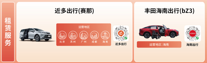 服務(wù)方面,為了能滿足消費者的臨時用車需求,自2024年5月開始,豐田中國聯(lián)合豐田金融旗下近多出行,逐步在北京、廣州、成都、蘇州,海南,開展賽那/格瑞維亞的福祉車租賃服務(wù)。只需登錄近多出行小程序或撥打客服熱線即可體驗。今年3月起,豐田海南出行也在海南推出了純電動bZ3福祉車的租賃服務(wù)。