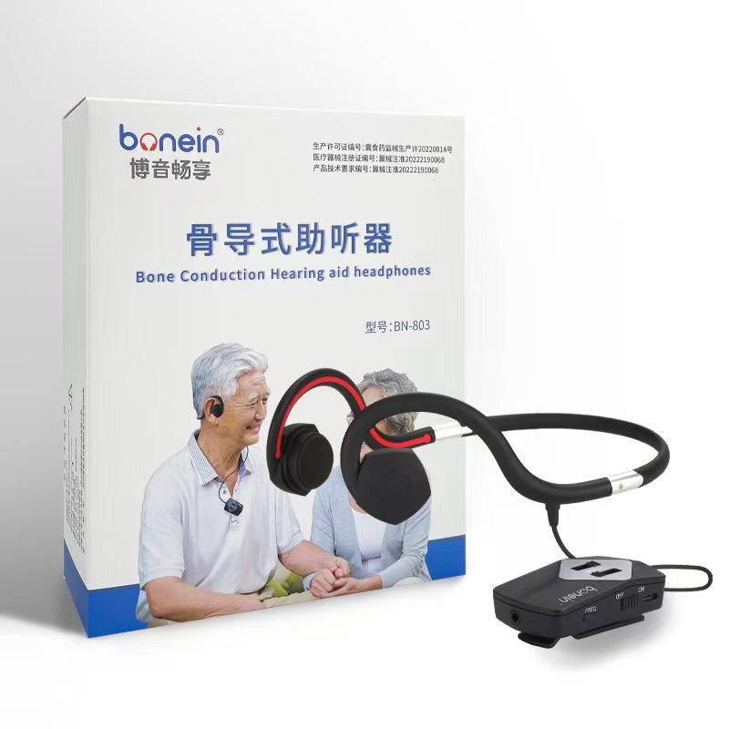 骨導式助聽器BN-803,不用塞進耳朵,通過骨頭聽聲音,讓用戶聽到聲音同時還可以舒適佩戴。這款左右耳音量單獨調(diào)節(jié),讓用戶左右聽聲保持平衡;有7個頻段選擇,用戶在家選擇合適頻段就可以使用;另外還可以連接手機打電話聽音樂。一鍵降噪功能,抑制噪音,增強人聲。公司獲得10多項專利認證。