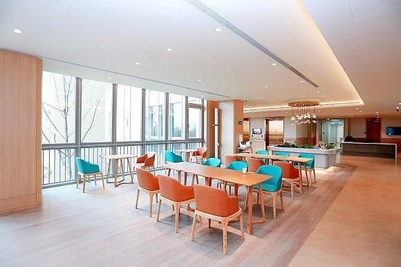 考慮到長者的身心特點,醫(yī)院室內(nèi)外均采取無障礙設(shè)計,并對就醫(yī)動線進(jìn)行了清晰規(guī)劃。落地觀景走廊設(shè)計,綠色與木色等色彩的調(diào)和營造出輕松溫暖的就醫(yī)氛圍。所有家具采用圓角設(shè)計、隨處可見的扶手和緊急呼叫系統(tǒng),將適老化細(xì)節(jié)做到極致。