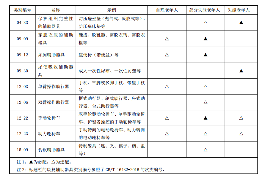 其中,《養(yǎng)老機(jī)構(gòu)康復(fù)輔助器具基本配置》規(guī)定了養(yǎng)老機(jī)構(gòu)內(nèi)個(gè)人使用和公用的康復(fù)輔助器具基本配置要求,并附錄了相應(yīng)的基本配置清單作參考。政策原文如下: