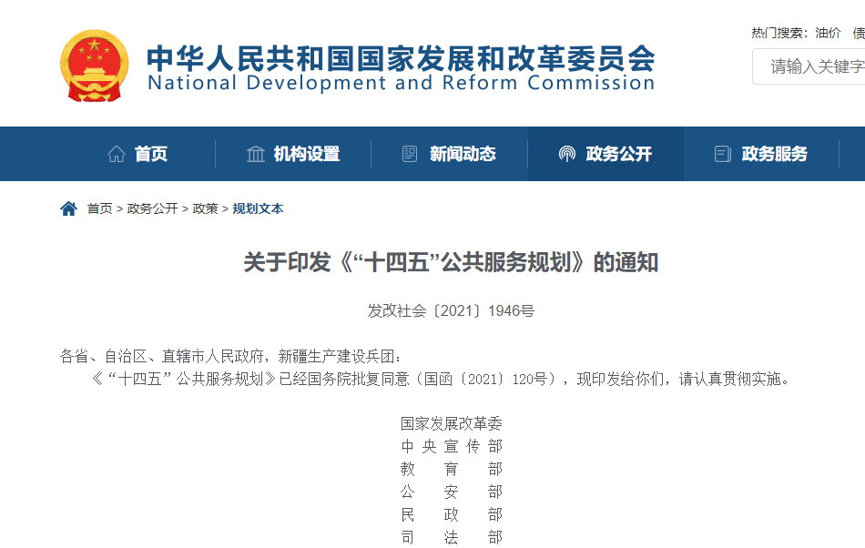 1月10日,國(guó)家發(fā)展和改革委員會(huì)發(fā)布關(guān)于《“十四五”公共服務(wù)規(guī)劃》的通知,此規(guī)劃依據(jù)《中華人民共和國(guó)國(guó)民經(jīng)濟(jì)和社會(huì)發(fā)展第十四個(gè)五年規(guī)劃綱要》編制,主要涵蓋幼有所育、學(xué)有所教、勞有所得、病有所醫(yī)、老有所養(yǎng)、住有所居、弱有所扶、優(yōu)軍服務(wù)保障和文體服務(wù)保障等領(lǐng)域的公共服務(wù)。