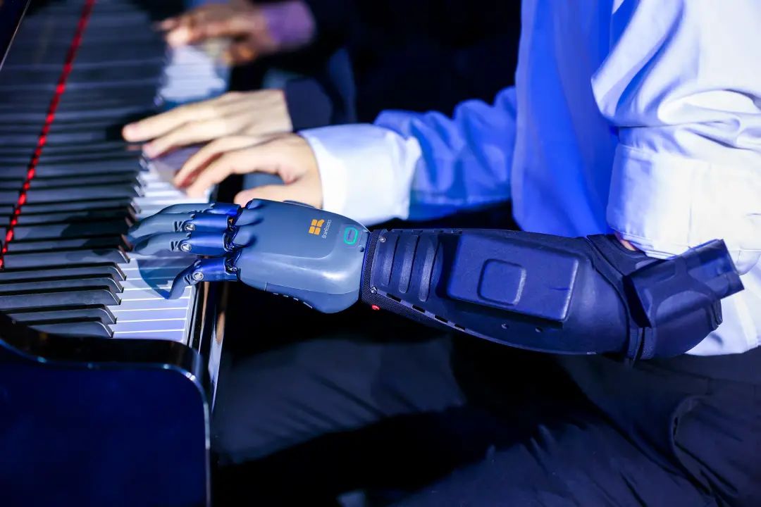 佩戴仿生手的殘疾人在現(xiàn)場彈鋼琴