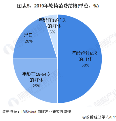 輪椅的主要需求領域為老年人口和傷殘人士,應用場景為醫(yī)院,居家養(yǎng)老以及傷殘康復。從消費主力群體來看,輪椅主要是超過65歲的老年人使用。目前輪椅在市場的消費主要集中在老年人群體,2019年占比約50%,年齡在18~64歲的消費群體占比約25%,此外還有約20%的部分用于出口,主要的出口國家包括美國、加拿大、澳大利亞、英國、阿根廷等等。