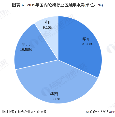 我國輪椅主要的生產基地集中在上海、廣東、江浙和天津等地區(qū),華南、華東地區(qū)占據(jù)主要市場。截止2019年,我國國內輪椅行業(yè)區(qū)域集中度分別為華東31.8%,華南39.6%,華北19.5%,其他9.1%。