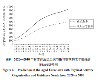 本研究基于體育強國建設與人口老齡化的現(xiàn)實背景,利用人口預測和增長曲線擬合的方法對我國“十四五”期間和中長期的老年體育鍛煉人口的規(guī)模和結構變動趨勢進行了預測。第一,我國參加體育鍛煉的老年人口總體規(guī)模將持續(xù)增長,“十四五”末期將達到8 471萬人,到2035年達到1.9億人,2050年達到2.6億人。第二,未來經(jīng)常參加體育鍛煉的老年人口年齡結構將進一步老化,高齡老年人占老年體育鍛煉者的比重有所上升。第三,參與各類體育活動項目的老年鍛煉者將快速增長,預計到2050年左右將有超過2億人規(guī)模的老年人經(jīng)常進行步行鍛煉。第四,各類場地需要承載的老年鍛煉者規(guī)模持續(xù)擴大,公園、廣場類需要承載的老年體育鍛煉者將在2050年達到1.8億人的規(guī)模。第五,老年人鍛煉時對正式組織和專業(yè)指導人員的需求將持續(xù)增加,到2050年約有600萬老年人需要通過正式組織的方式進行鍛煉,約927萬老年人需要專業(yè)體育指導人員進行指導。