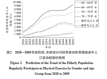 摘要:運用人口預測和增長曲線擬合方法,利用2018年國家統(tǒng)計局1‰人口抽樣調(diào)查數(shù)據(jù)和2018年《中國老年社會追蹤調(diào)查》數(shù)據(jù),對我國經(jīng)常參加體育鍛煉的老年人口規(guī)模和結構等狀況進行發(fā)展趨勢預測分析。結果顯示,我國經(jīng)常參加體育鍛煉的老年人口總規(guī)模將持續(xù)增長,預測到“十四五”末期將增長至8 471萬人,到2035年達到1.9億人,2050年達到2.6億人。未來一段時期內(nèi),經(jīng)常參加體育鍛煉的老年人口年齡結構將進一步老化,參與各類體育活動的人口數(shù)量將快速增長,對鍛煉場地、專業(yè)組織和指導人員的需求顯著增加。