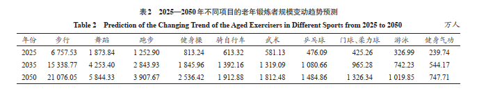 2018年CLASS數(shù)據(jù)顯示,步行是最受老年人歡迎的鍛煉項目,約有79.77% 參與鍛煉的老年人會選擇步行方式;跳舞、跑步、健身操也是老年人參與度較高的幾種鍛煉方式,占比分別為22.12%、14.79%、9.60%。本研究假設參加體育鍛煉的老年人群體對于不同鍛煉活動的偏好程度維持不變,可以預測參加各項體育鍛煉的老年人數(shù)量變動趨勢(表2)。