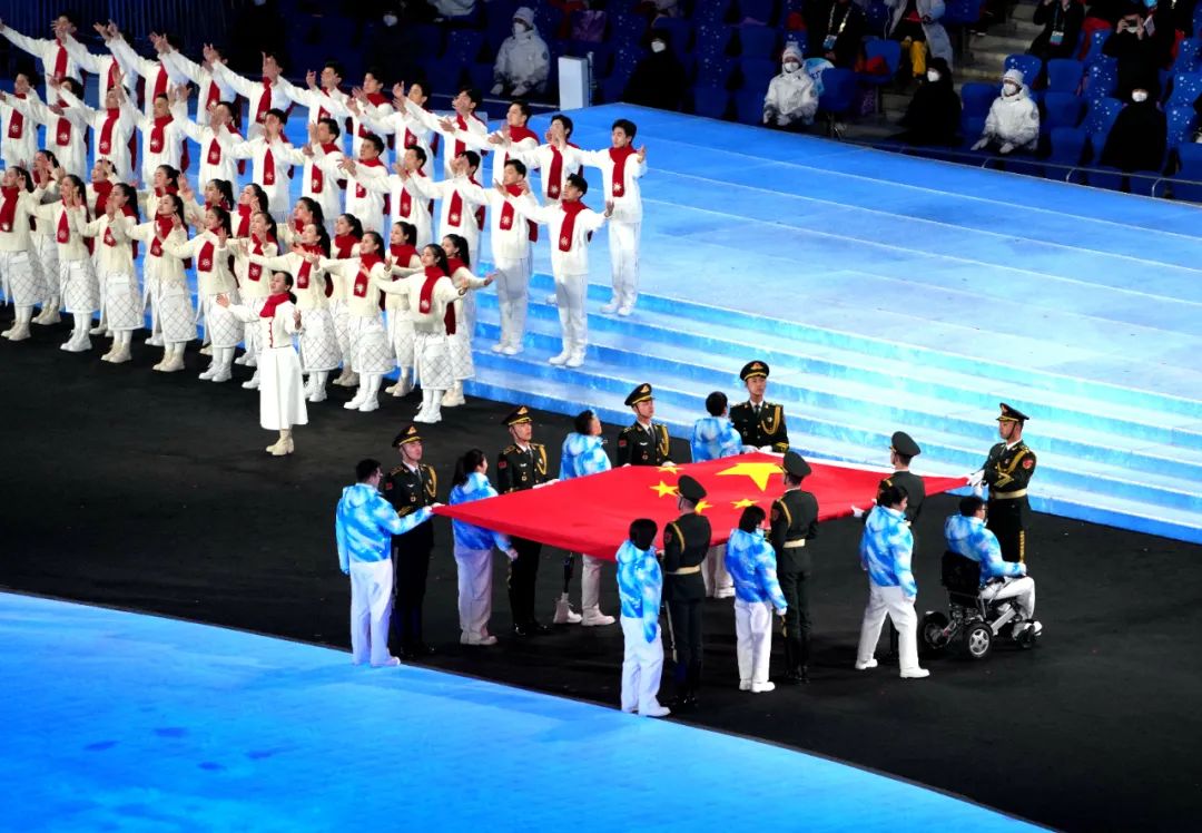 鳥(niǎo)巢中央,一面五星紅旗在殘疾人運(yùn)動(dòng)員和為殘疾人事業(yè)做出突出貢獻(xiàn)的8位護(hù)旗手的護(hù)送下,莊嚴(yán)入場(chǎng)。中華人民共和國(guó)國(guó)歌奏響,五星紅旗冉冉升起,迎風(fēng)飄揚(yáng)。