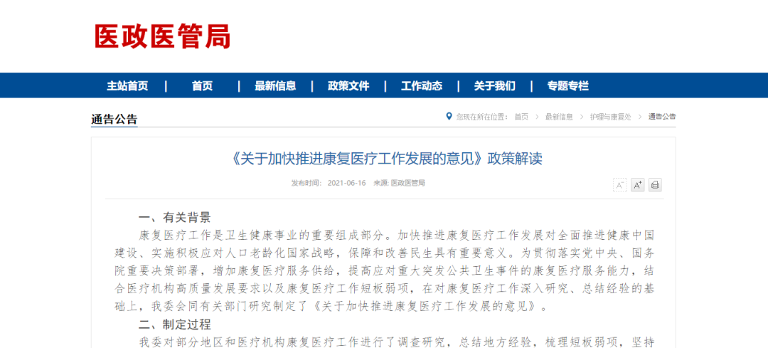 為貫徹落實(shí)黨的十九屆五中全會(huì)精神和實(shí)施健康中國(guó)、積極應(yīng)對(duì)人口老齡化的國(guó)家戰(zhàn)略,進(jìn)一步加強(qiáng)康復(fù)醫(yī)療服務(wù)體系建設(shè),加快推動(dòng)康復(fù)醫(yī)療服務(wù)高質(zhì)量發(fā)展,逐步滿足群眾多樣化、差異化的康復(fù)醫(yī)療服務(wù)需求,國(guó)家衛(wèi)生健康委、國(guó)家發(fā)展改革委、教育部、民政部、財(cái)政部、國(guó)家醫(yī)保局、國(guó)家中醫(yī)藥管理局、中國(guó)殘聯(lián)制定了《關(guān)于加快推進(jìn)康復(fù)醫(yī)療工作發(fā)展的意見(jiàn)》。