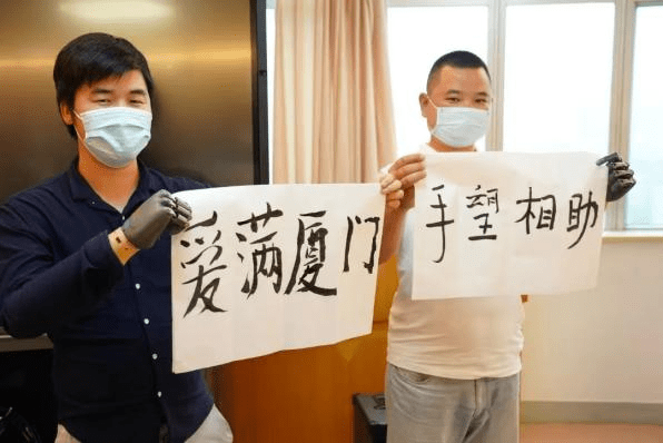 活動(dòng)現(xiàn)場(chǎng),幾位殘疾人朋友佩戴BrainCo強(qiáng)腦科技智能仿生手,手握毛筆寫下“愛滿廈門”、“手望相助”等字