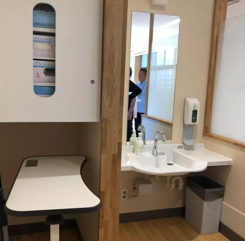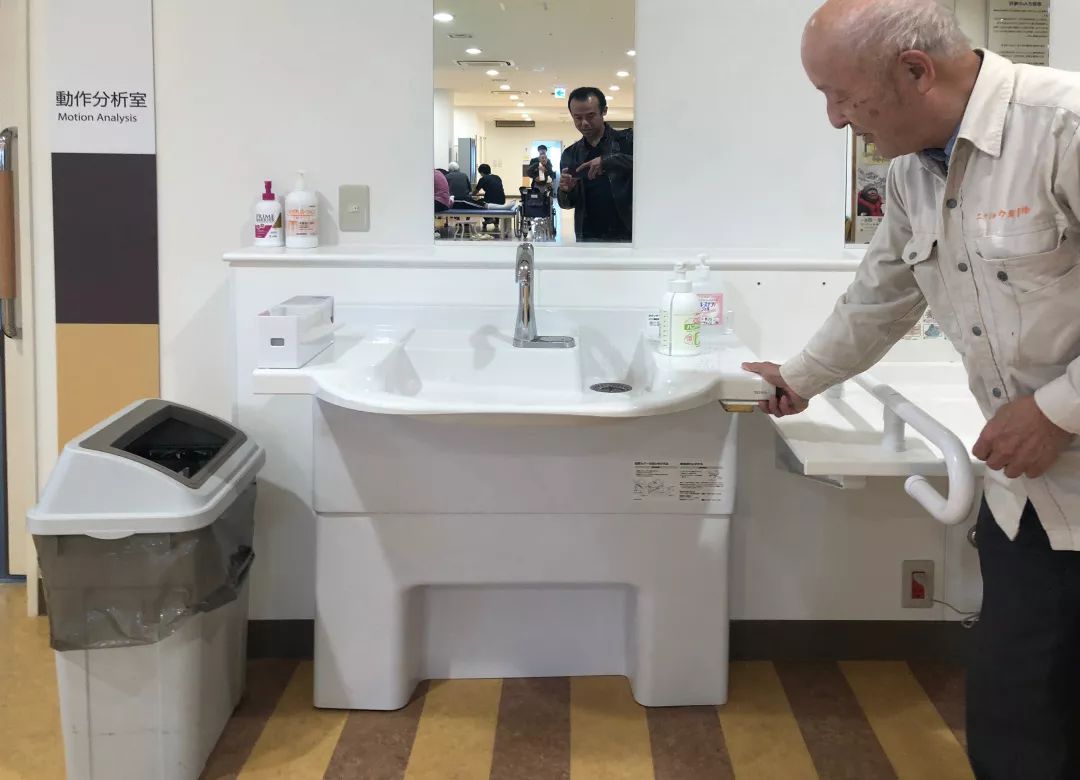 首先是在大廳入口處,兩組并排的洗手池。前排較高給站立者,后排給輪椅使用者。全部都配有獨(dú)立小廚寶和扶手: