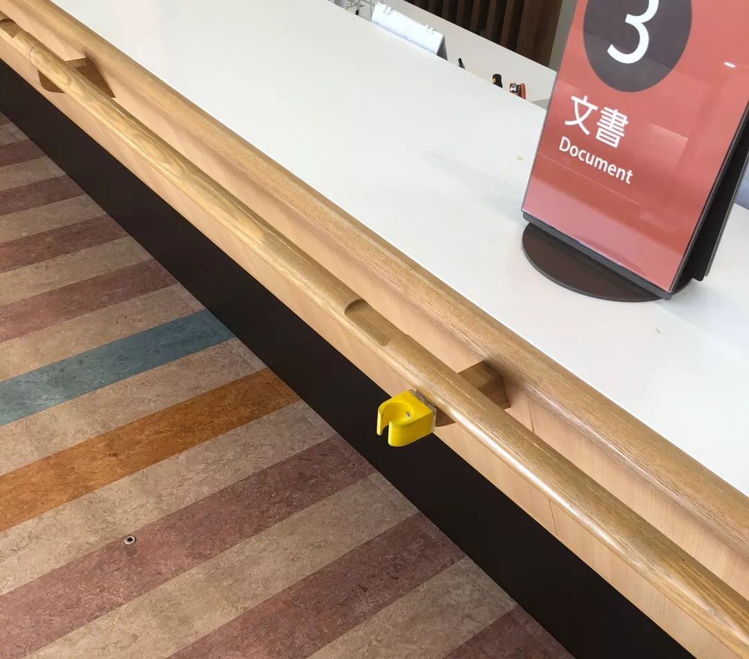 靠近一點(diǎn)便會發(fā)現(xiàn)接待臺周邊各種人性化的輔助細(xì)節(jié):扶手欄桿、勾雨傘的凹槽、放拐杖的小扣,一氣呵成:
