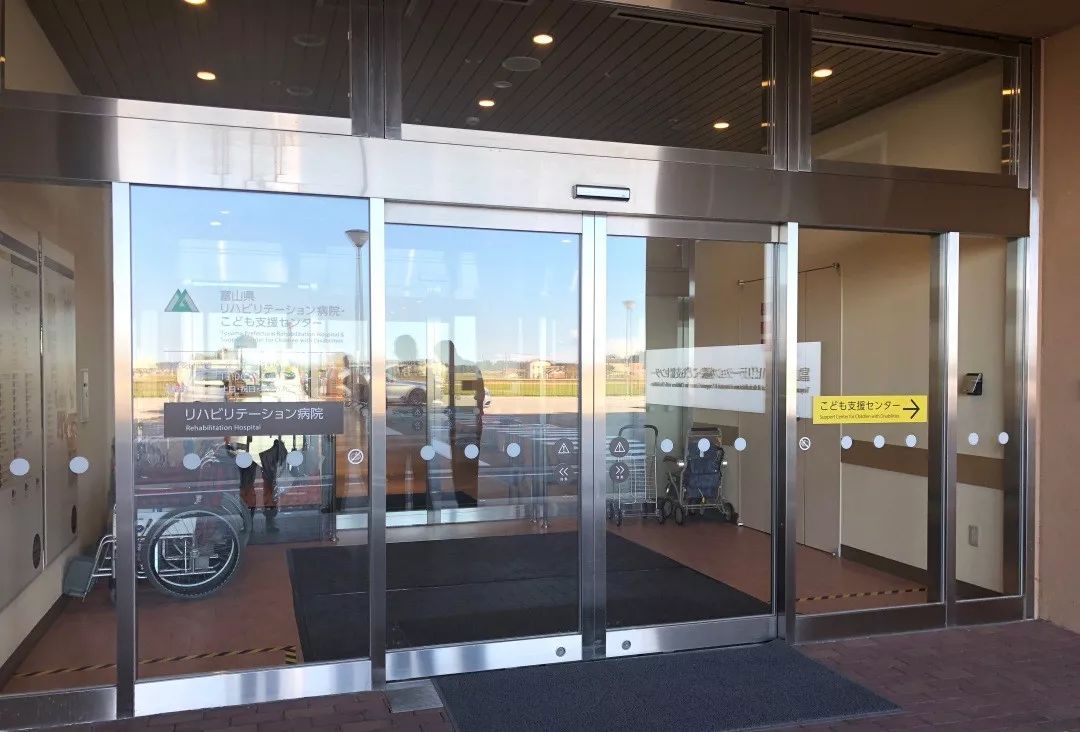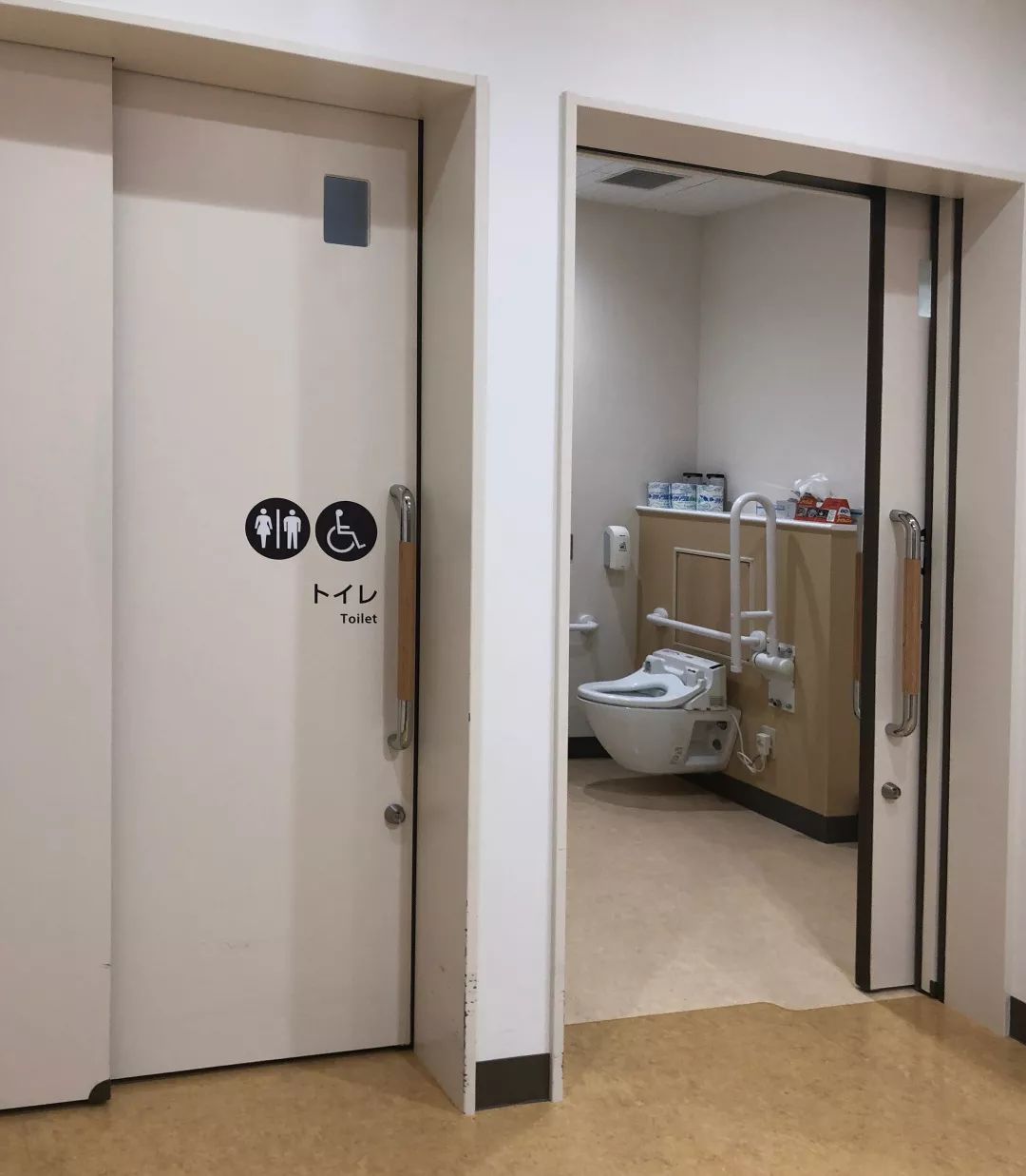 往病房區(qū)走去。在走廊經(jīng)過了一對衛(wèi)生間(真的是一對)。衛(wèi)生間采用的推拉門,配備延遲關(guān)閉的五金和門邊防撞條,防止夾手。地上不需要有軌道,避免污垢積聚。另外設(shè)置了兩個鏡像的衛(wèi)生間,一個是用右手開門及操作,另一個是用左手,很貼心。這是為單手受傷的患者而考慮設(shè)計(jì)的: